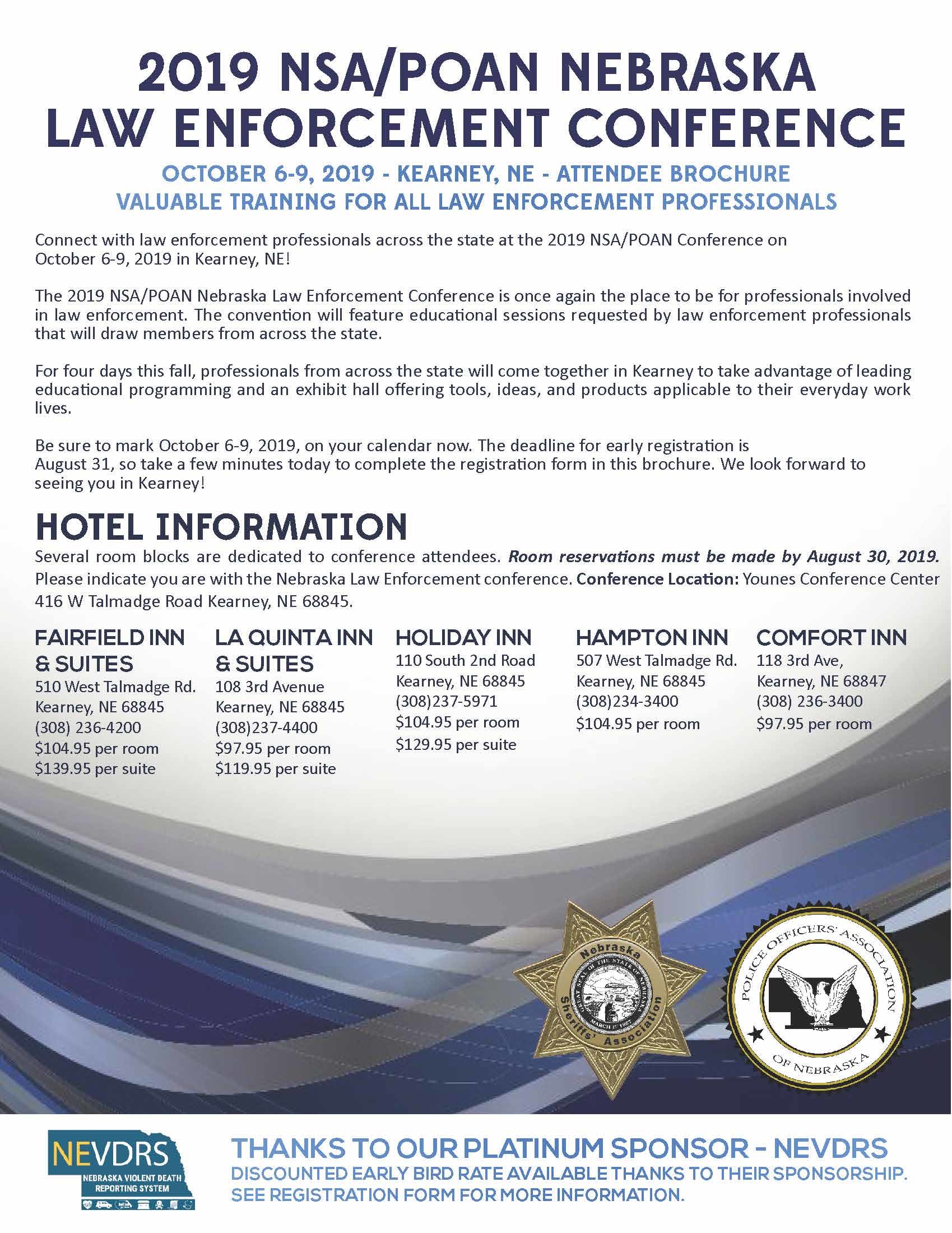 Connect with law enforcement professionals across the state at the 2019 NSA/POAN Conference on October 6-9, 2019 in Kearney, NE! The 2019 NSA/POAN Nebraska Law Enforcement Conference is once again the place to be for professionals involved in law enforcement. The convention will feature educational sessions requested by law enforcement professionals that will draw members from across the state. For four days this fall, professionals from across the state will come together in Kearney to take advantage of leading educational programming and an exhibit hall offering tools, ideas, and products applicable to their everyday work lives. Be sure to mark October 6-9, 2019, on your calendar now. The deadline for early registration is August 31, so take a few minutes today to complete the registration form in this brochure. We look forward to seeing you in Kearney!
