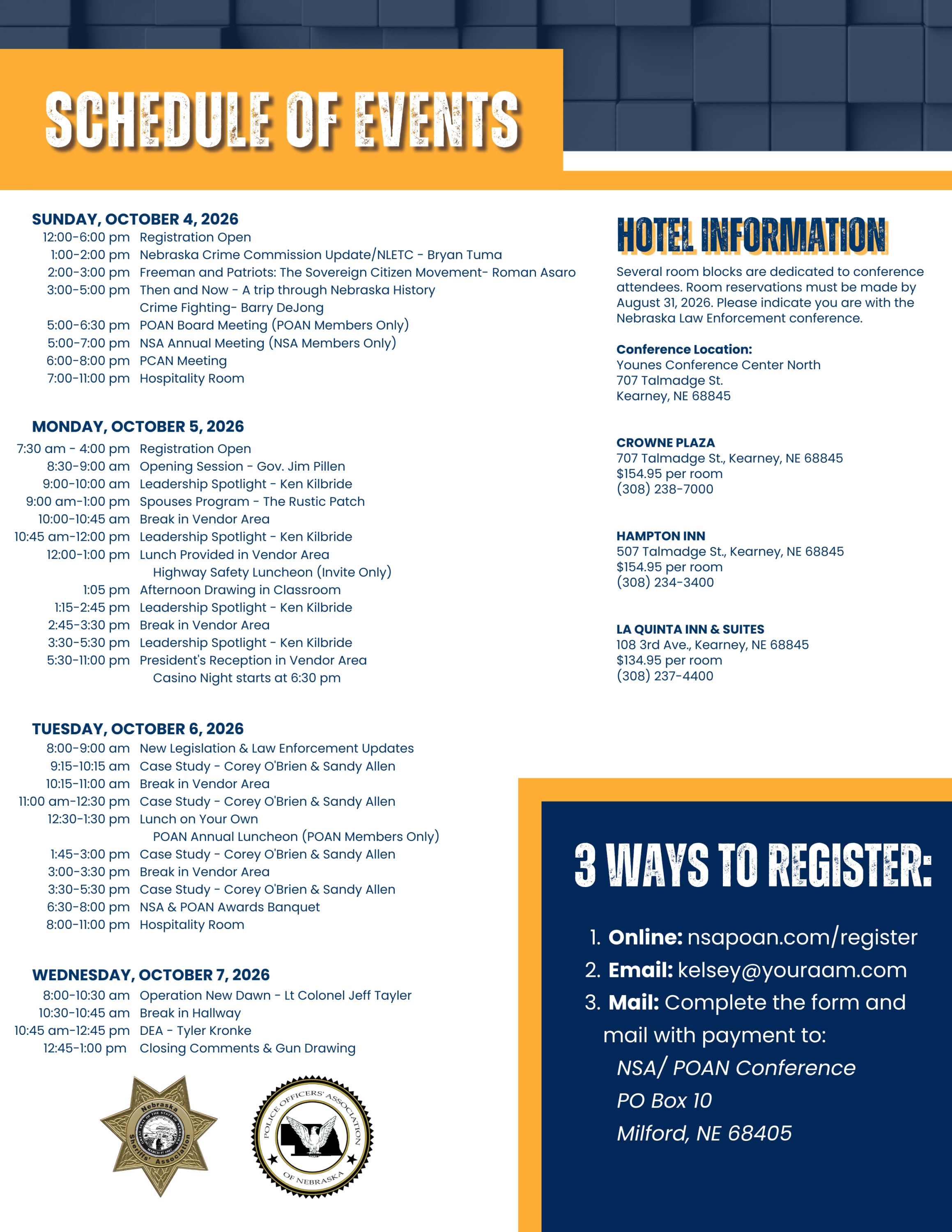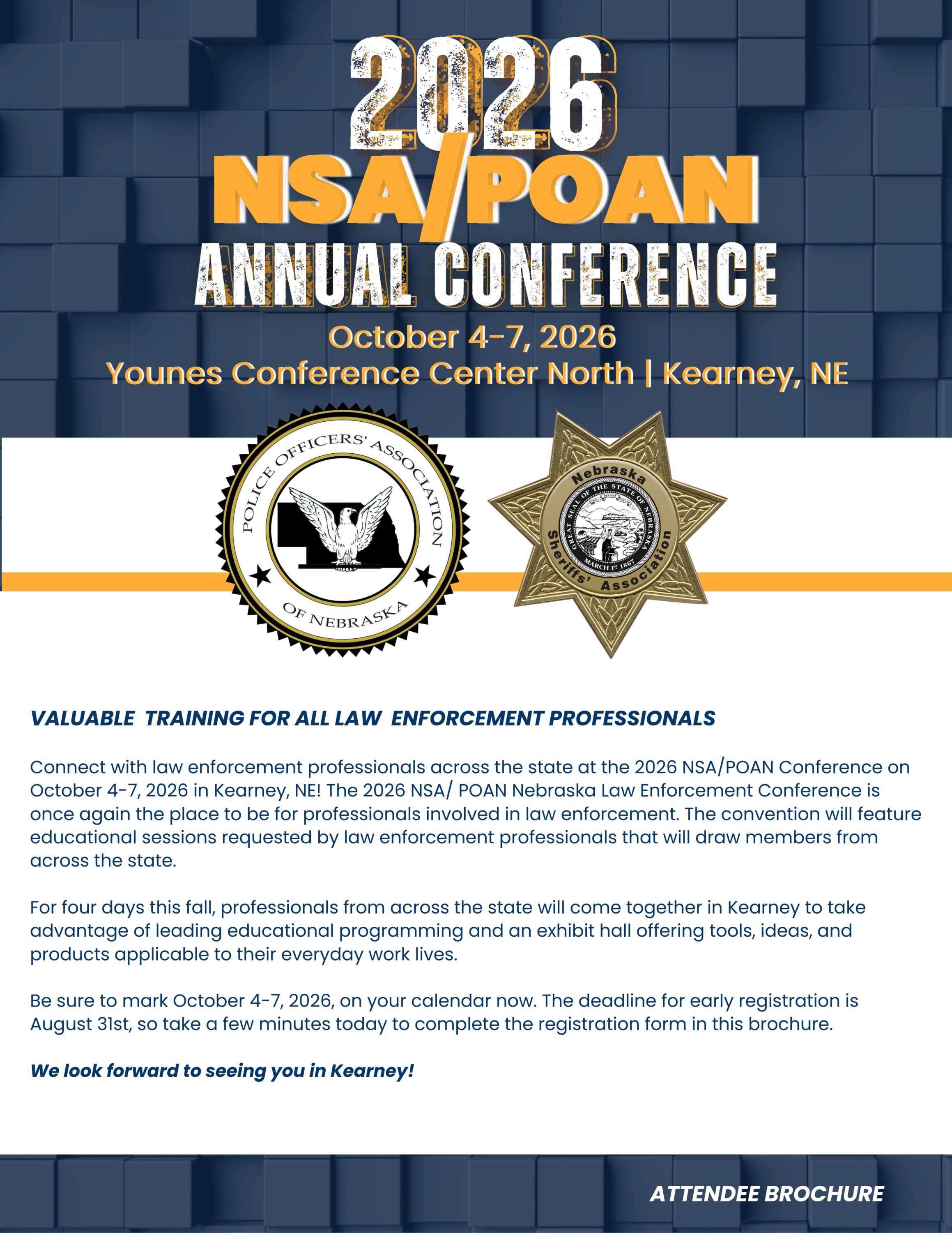 Connect with law enforcement professionals across the state at the 2026 NSA/POAN Conference on October 4-7, 2026 in Kearney, NE! The 2026 NSA/POAN Nebraska Law Enforcement Conference is once again the place to be for professionals involved in law enforcement. The convention will feature educational sessions requested by law enforcement professionals that will draw members from across the state. For four days this fall, professionals from across the state will come together in Kearney to take advantage of leading educational programming and an exhibit hall offering tools, ideas, and products applicable to their everyday work lives. Be sure to mark October 4-7, 2026, on your calendar now. The deadline for early registration is August 31st, so take a few minutes today to complete the registration form in this brochure. We look forward to seeing you in Kearney! Please contact the NSA/POAN Office with any questions. ______________________________________________________________________________________ Cancellation Policy: A refund, less a $25 administrative fee, will be given for all written requests postmarked by August 31, 2026. Requests received after that date will be reviewed by the NSA/POAN Conference Committee. In the unlikely event the 2026 Conference is cancelled due to uncontrollable circumstances, your payment will be considered a donation to the NSA/POAN Conference. By registering for a NSA/POAN event you acknowledge the contagious nature of the Coronavirus/COVID-19. You acknowledge that you must comply with all set procedures while attending the NSA/POAN event. You also agree to release the Nebraska Sheriffs' Association, the Police Officers' Association of Nebraska, affiliated partners and sponsors from any liability or claim that you, your heirs, or any personal representatives may have against the Nebraska Sheriffs' Association, the Police Officers' Association of Nebraska, affiliated partners and sponsors with respect to any bodily injury, illness, death, medical treatment, or property damage that may arise from, or in connection to, any services received from the Nebraska Sheriffs' Association, the Police Officers' Association of Nebraska, affiliated partners and sponsors.